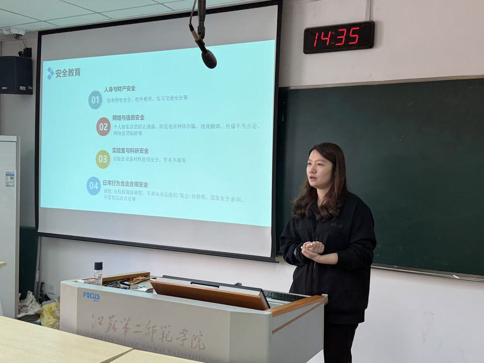 倪艺洋结合近期典型案例,对学生进行了多维度的安全教育。强调宿舍用电安全规范,要求同学们严格遵守校规校纪,杜绝违规电器使用。在网络与信息安全方面,特别提醒同学们规范使用网络工具,学术研究所需的境外网站访问应坚守合规底线,远离政治性、宗教性敏感网站,警惕邮件病毒、网络诈骗及网络借贷等风险。针对少数校外住宿学生,明确提出需事先提交包含家长知情同意书、安全责任书在内的报备材料,确保学生人身安全可管可控。会上还重申了实验室操作安全、实习交通安全等注意事项,要求同学们强化自我保护意识,远离传销、非法集会等不良活动。