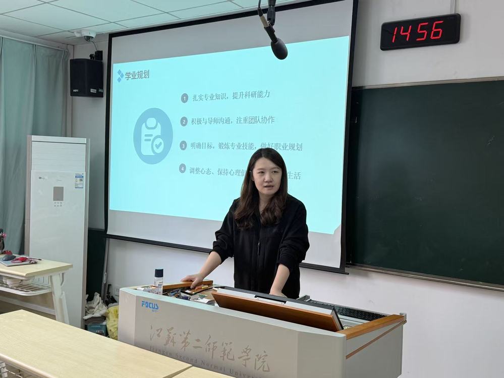 围绕研究生学业规划与科研能力提升,倪艺洋副主任鼓励同学们深耕专业领域,积极发表学术成果,为职业发展奠定坚实基础。她强调,在数字化时代背景下,应主动探索跨学科融合路径,将人工智能等先进技术与专业学习相结合,适应教育教学数字化转型需求。会上特别推介了江苏省研究生学术论坛,学校将为参赛同学提供专项辅导,助力同学们提升学术表达能力,在省级平台展现科研风采。同时,针对学业焦虑问题,倪艺洋以自身培养经验为例,鼓励同学们保持积极心态,合理规划时间,主动与导师沟通科研进展。